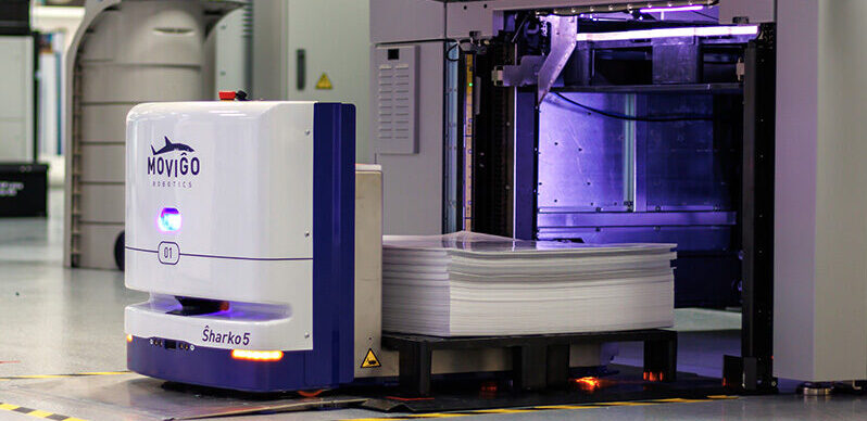 The Ŝharko5 integrates with the Print Shop in various ways. Using our Vision Technology for example, our solution is able to manage buffer areas autonomously, guaranteeing media is available and printed material goes to the next station.