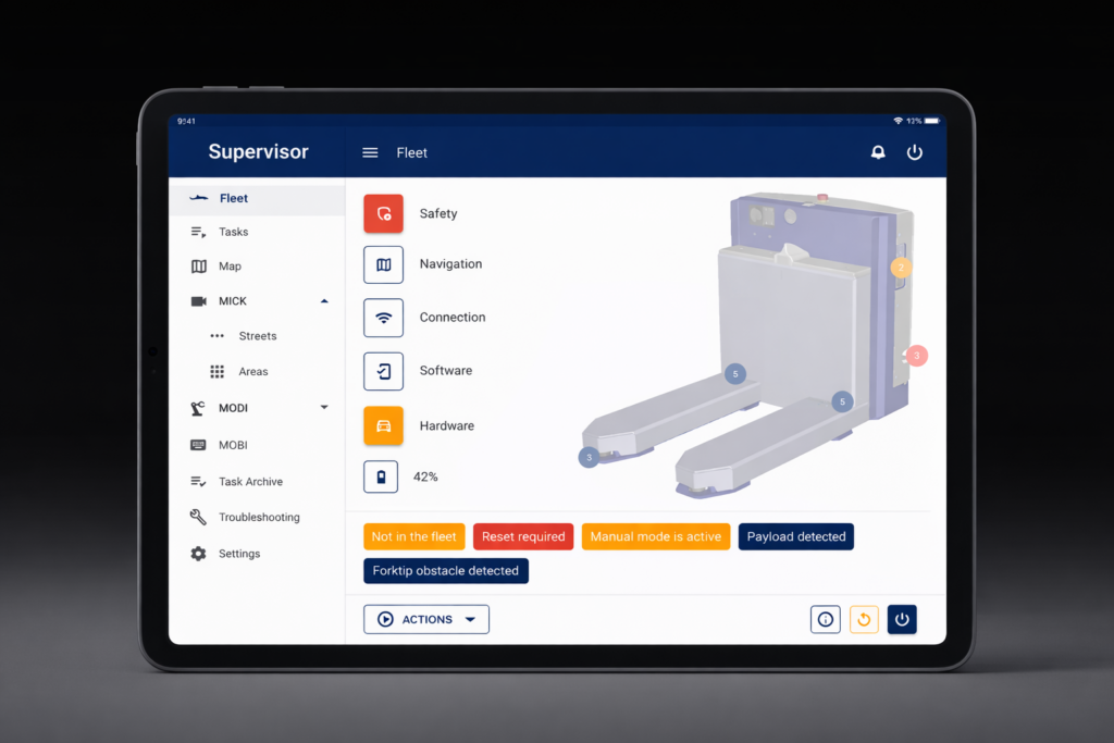 If automatic task generation via integration with your ERP/WMS system or MICK Vision Software is not possible, MOBI is the alternative. It allows an operator to manually generate a task for the fleet via virtual buttons on a tablet. It is the equivalent of pressing an actual button, without installing physical buttons. We can configure MOBI’s smart buttons to allow you to assign different tasks to buttons, and let’s you manage them easily. You can also add values or priorities to tasks and assign drop-off areas.